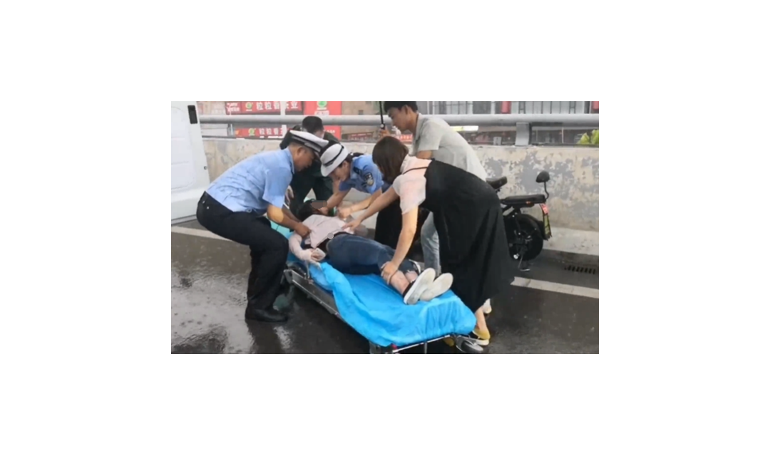 女孩骑车撞桥栏 警民共演雨中情