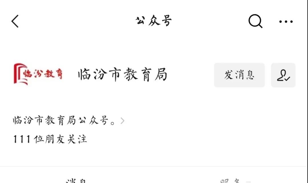 目前,临汾市教育局仅通过官方微信公众号“临汾市教育局”(微信ID:gh_0bccc07f5219)在微信平台上提供教育资讯及服务,账号...