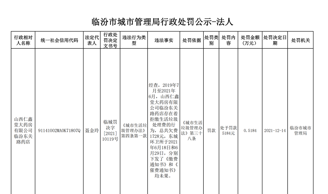 2019年7月至2021年6月,山西仁鑫堂大药房有限公司临汾东关路药店存在着拒缴生活垃圾处理费的行为,总共欠费1728元,东城环卫...