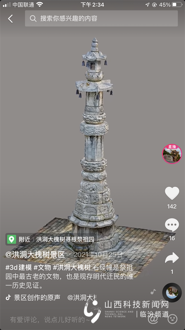 在服务方面,洪洞大槐树景区注重线上一站式服务。通过微信、支付宝、游客购买电子票、扫码预约、刷脸入园、 AR一景新看 、电子导游、VR全景等数字服务,游客朋友可以获得更简单、更便捷的旅游体验。在管理方面,洪洞大槐树景区注重数字化智慧管理。利用无人机及3D建模技术创建石经幢的数据信息,更好地保护古文物;运用人流量监测系统,对景区游客流量的实时动态监测,确保疫情防控下合理的景区人流量。