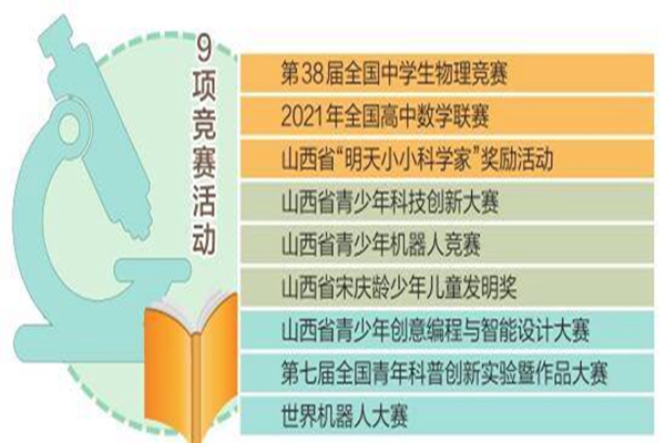 这9项竞赛活动包括第38届全国中学生物理竞赛、2021年全国高中数学联赛、山西省“明天小小科学家”奖励活动、山西省青少年科技创新大赛、山西省青少年机器人竞赛、山西省宋庆龄少年儿童发明奖、山西省青少年创意编程与智能设计大赛、第七届全国青年科普创新实验暨作品大赛、世界机器人大赛。竞赛活动举办时间原则上为2021年12月底前,人员聚集的竞赛活动需符合当地疫情防控要求,确保安全有序实施。