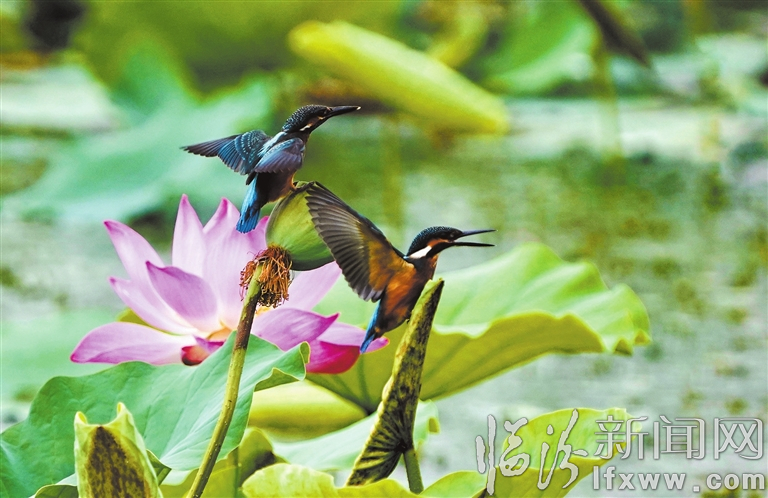 夏日,在汾河文化生态景区,争奇斗艳的荷花迎来一批特殊的“游客”——国家二级保护动物翠鸟。美丽的翠鸟有的在荷塘里飞舞,有的在花蕾上小憩或嬉戏,有的忙着捕食鱼儿、喂食幼鸟,给夏日的荷塘增添了灵气。