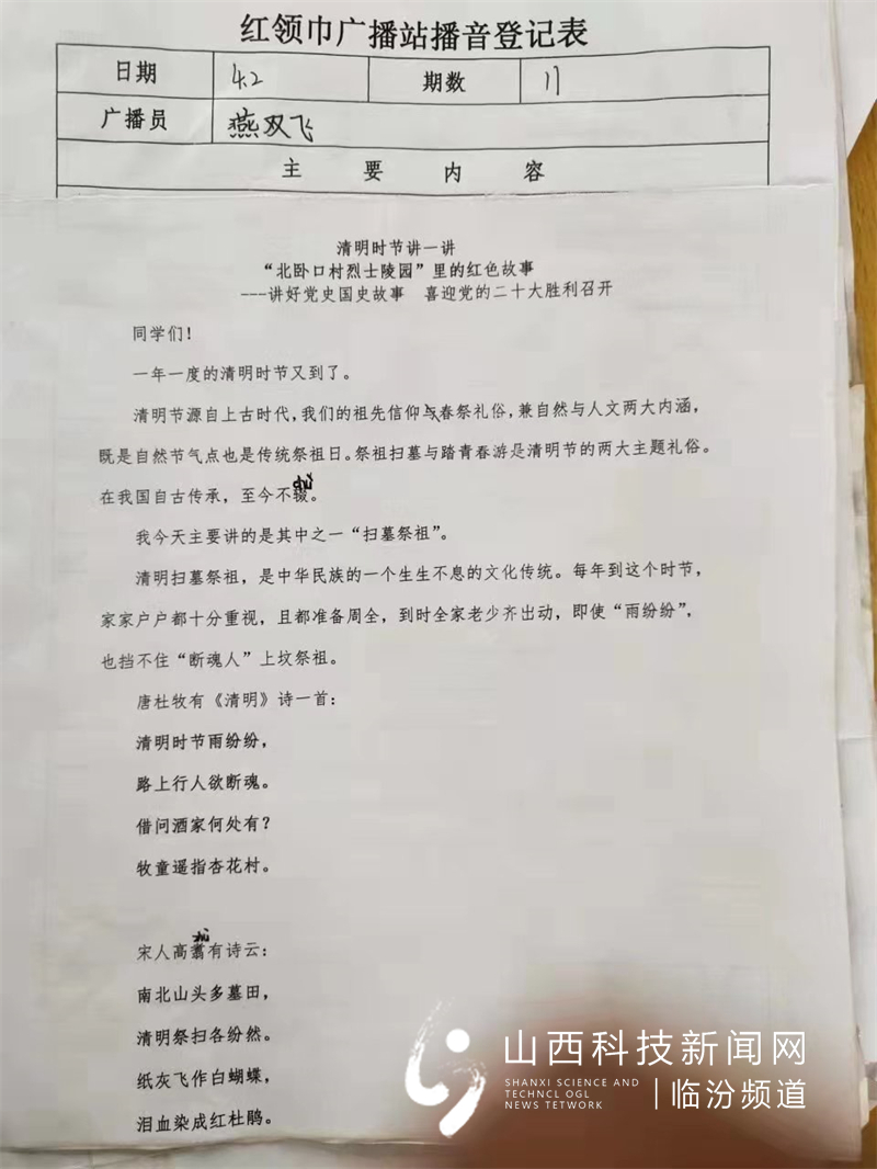 山西科技新闻网临汾频道讯 为了营造健康活泼的校园文化氛围,丰富学生的校园生活,给学生搭建一个自我展示的舞台,增强学生的主人翁意识,尧都区刘村镇刘村中心小学少先队大队部决定建设“红领巾广播站”,经过一个月的紧张筹备,2022年3月21日,刘村中心小学“红领巾广播站”正式成立!