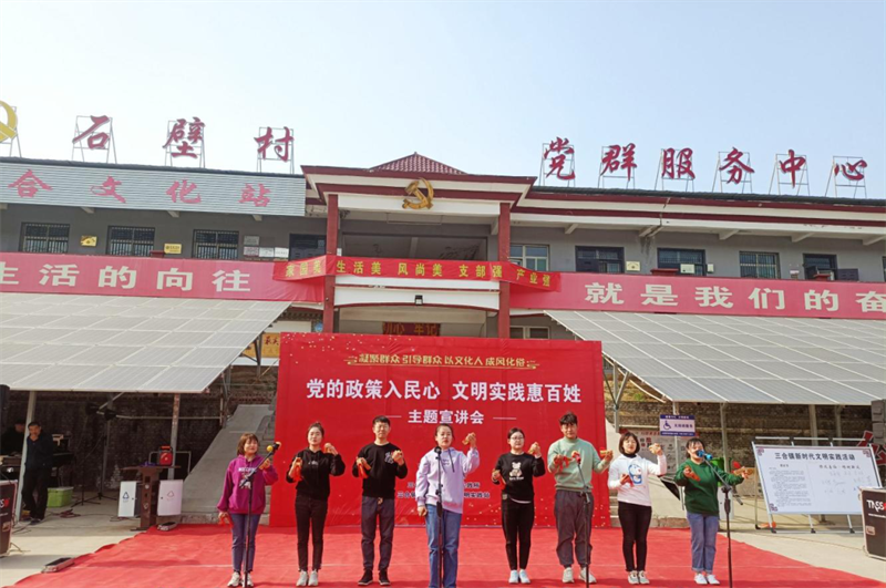 为丰富理论宣讲载体,使文明的节奏与群众的步伐同频共振,深得群众喜爱。用群众喜闻乐见的方式和载体,如“青年宣讲”、快板表演等创新形式,增强吸引力和感染力,变群众被动理解为主动接受。有奖问答更是用“幽默语言”,将政策“讲起来”、气氛“活”起来;志愿者下场与群众面对面发放宣传册,让理论“动”起来,场子“热起来”。