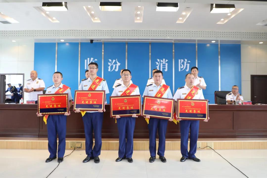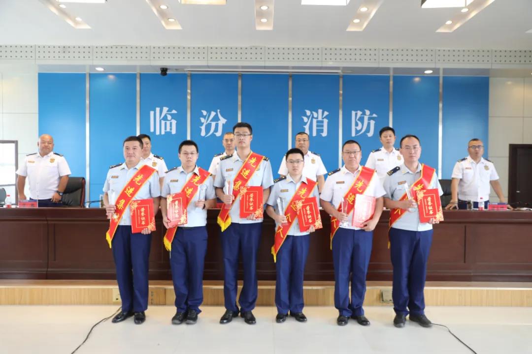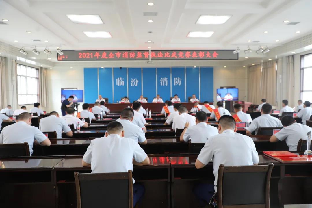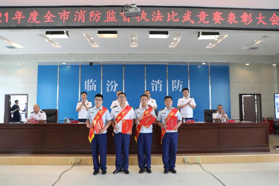 会上宣读了《临汾市消防救援支队关于对2021年防火监督执法比武竞赛情况的通报》和《临汾市消防救援支队关于对2021年度消防监督执法比武竞赛先进集体和个人通报表彰的决定》,支队党委为受表彰的5个比武竞赛先进集体、10名比武竞赛先进个人、9名单项成绩先进个人颁发了奖牌和证书。