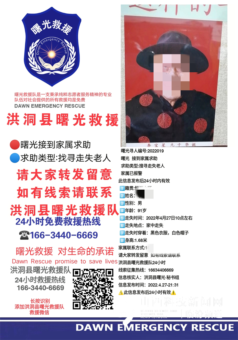 27日晚9时20分,洪洞县曙光救援队接到一求助电话,称家里一91岁的老人离家出走,家里人到处寻找,到现在仍无任何音讯。
