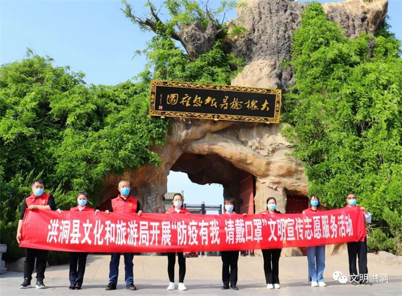 志愿者们在各乡镇、校园、景区和各大商场、超市、广场、公园、车站、主要交通路口和利用小喇叭提醒广大市民正确规范佩戴口罩,并为未佩戴口罩的群众发放口罩,同时,洪洞县气象局利用电视天气预报向大众倡导戴口罩。