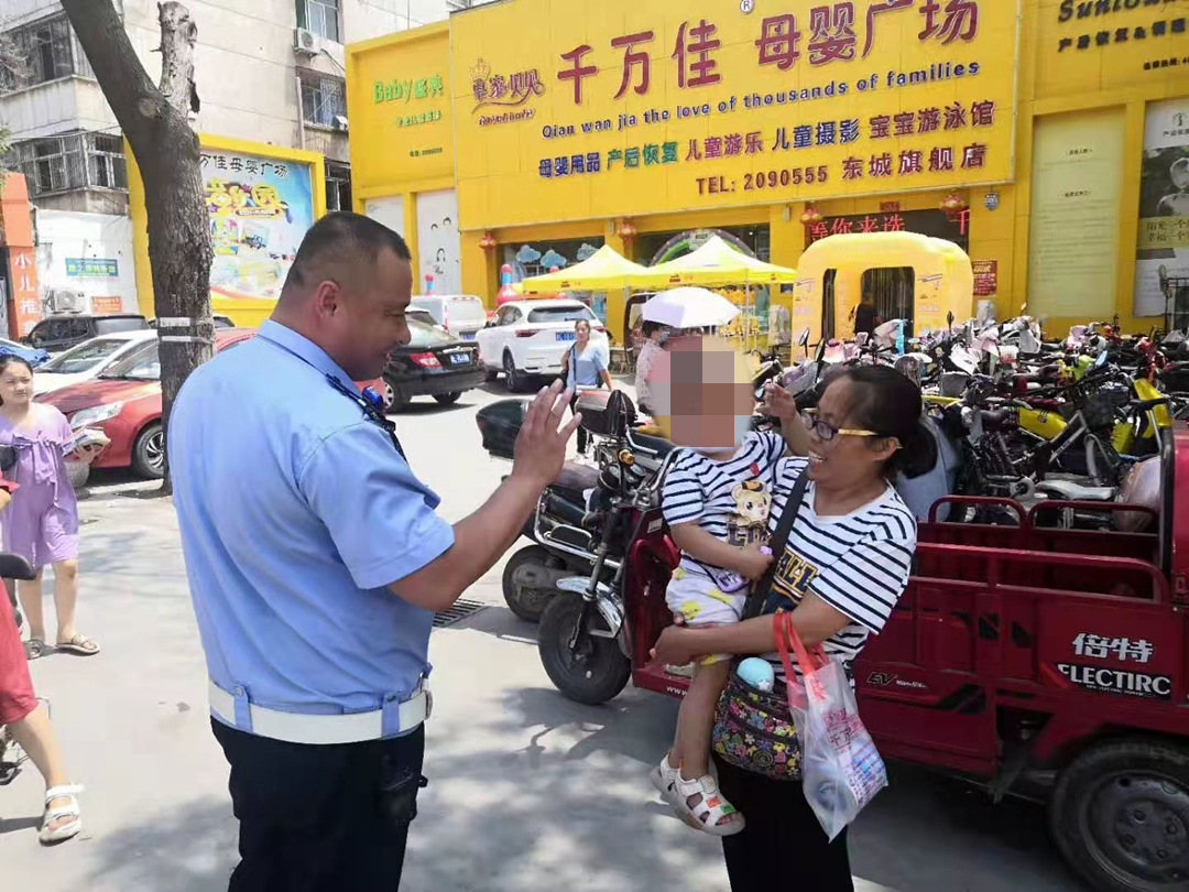 此时正值车流、人流量高峰期,尉伟立即上前将男童带到安全地带并安抚孩子的情绪,由于小男孩的年龄较小,无法提供家人及家庭住址等有效信息,尉伟一边陪护着男童一边将现场情况向中队领导汇报,不一会儿,一位戴着眼镜的女士急匆匆赶来,见到男童后情绪激动地说:“是我不小心让孩子走丢了”。说完她紧紧抱着孩子。经了解,该女士带孩子去旧货市场附近母婴广场购物,在商场门口因疏忽大意将孩子丢失。