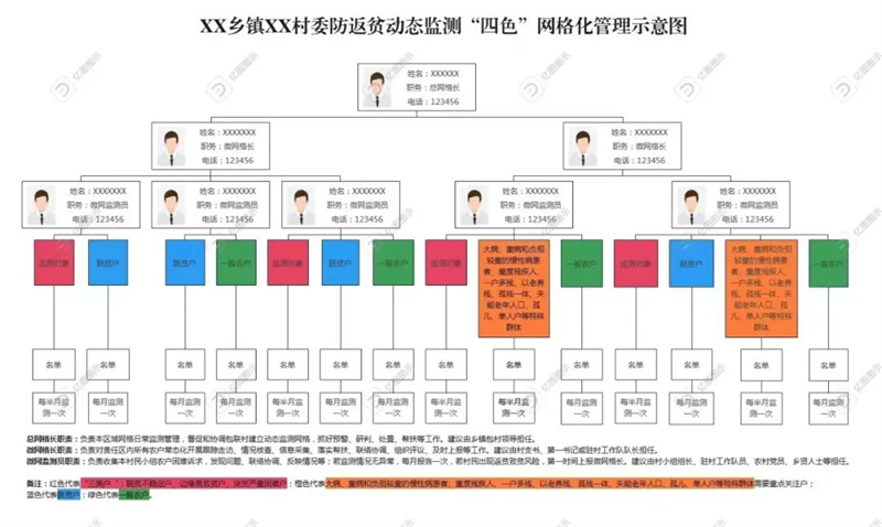 组建“三级网格”。一是县级网格。县乡村振兴局牵头,协同公安、民政、教育、卫体、医保、人社、住建、水利、农业农村、应急、残联等部门,组建一级责任网格,主要负责加强部门信息预警,做好督查指导、协调推进、政策帮扶、业务培训等工作。二是乡(镇)级网格。各乡(镇)组建二级责任网格,主要负责人牵头落实村级防返贫动态监测和帮扶网格化管理,督促和协调包联村建立动态监测网格,抓好预警、研判、处置、帮扶等工作。各乡(镇)分管负责人做好本乡(镇)网格化日常监测的管理工作。三是村级网格。各村党组织书记、第一书记和驻村工作队长组建三级责任网格,乡(镇)包村干部任网格长,村支书、第一书记或驻村工作队长任微网格长;村民小组长、驻村工作队员、农村党员、乡贤人士等任微网监测员,主要负责对辖区内所有农户进行“四色管理”,开展常态化跟踪走访、情况核查、信息采集、落实帮扶、联络协调、组织评议、及时上报等工作。