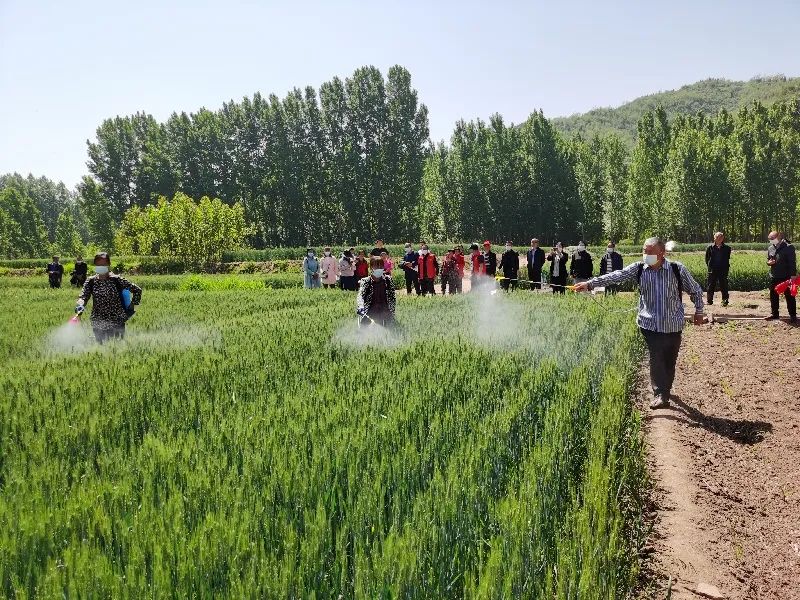 培训现场,王敏针对小麦中后期水肥管理措施及保穗增粒等田间管理技术进行了详细讲解;武红平就防病治虫、除草方面的科学用药和农药安全使用常识进行了培训;陈永杰就小麦后期“一喷三防”选什么药、如何使用二次稀释法配药、均匀喷施进行了演示。