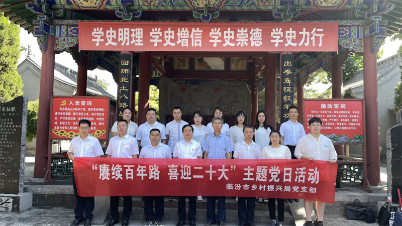 为庆祝建党101周年,喜迎党的二十大胜利召开,6月28日上午,临汾市乡村振兴局党支部在洪洞县红军八路军纪念馆(白石温家大院)开展“赓续百年路,喜迎二十大”主题党日活动。局党组书记、局长李永升,党组成员、副局长张友邦带队出席活动。机关及下属事业单位全体党员参加此次活动。