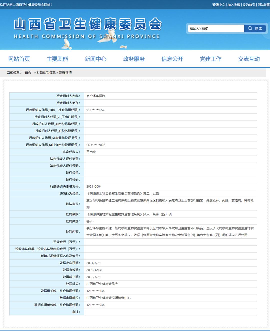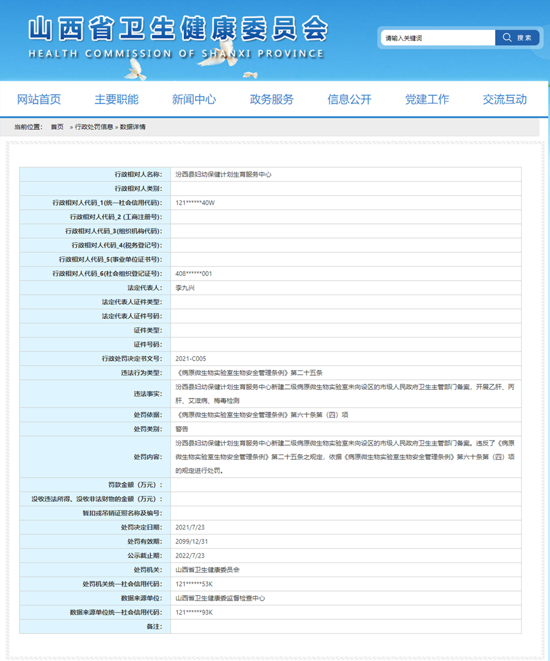 山西科技新闻网临汾频道讯(王继发) 据山西省卫健委消息,汾西县妇幼保健计划生育服务中心、襄汾泽华医院两家医疗机构均因新建二级病原微生物实验室未向设区的市级人民政府卫生主管部门备案,开展乙肝、丙肝、艾滋病、梅毒检测,被山西省卫健委分别处以警告处罚。