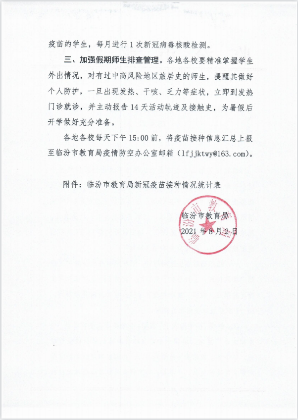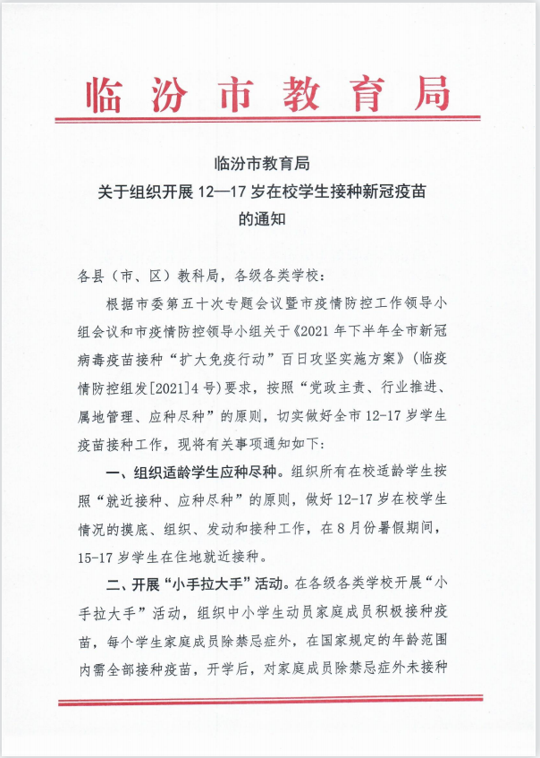 根据国家、临汾市统⼀部署,我市已开展对12-17岁⼈群的新冠疫苗接种工作。为及早建⽴免疫屏障,有效降低病毒感染⻛险,请⼴⼤教职工和家长们全力支持、密切配合,为孩子们构筑好⼀道抗疫防线。