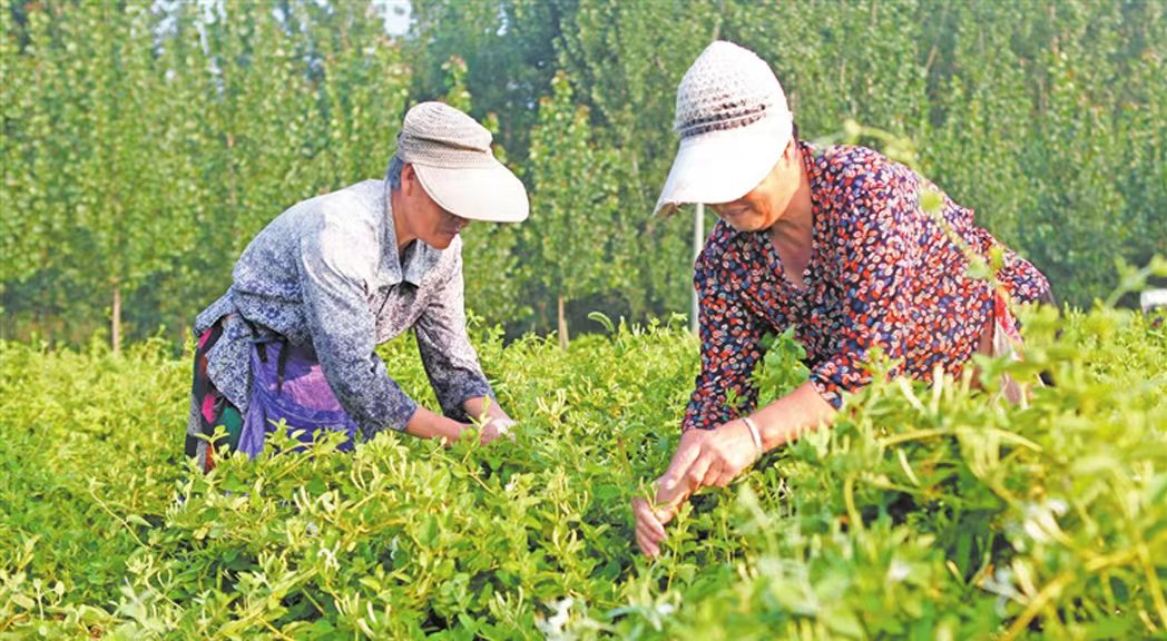 近日,在襄汾县南辛店乡中陈村,农民在采收金银花。