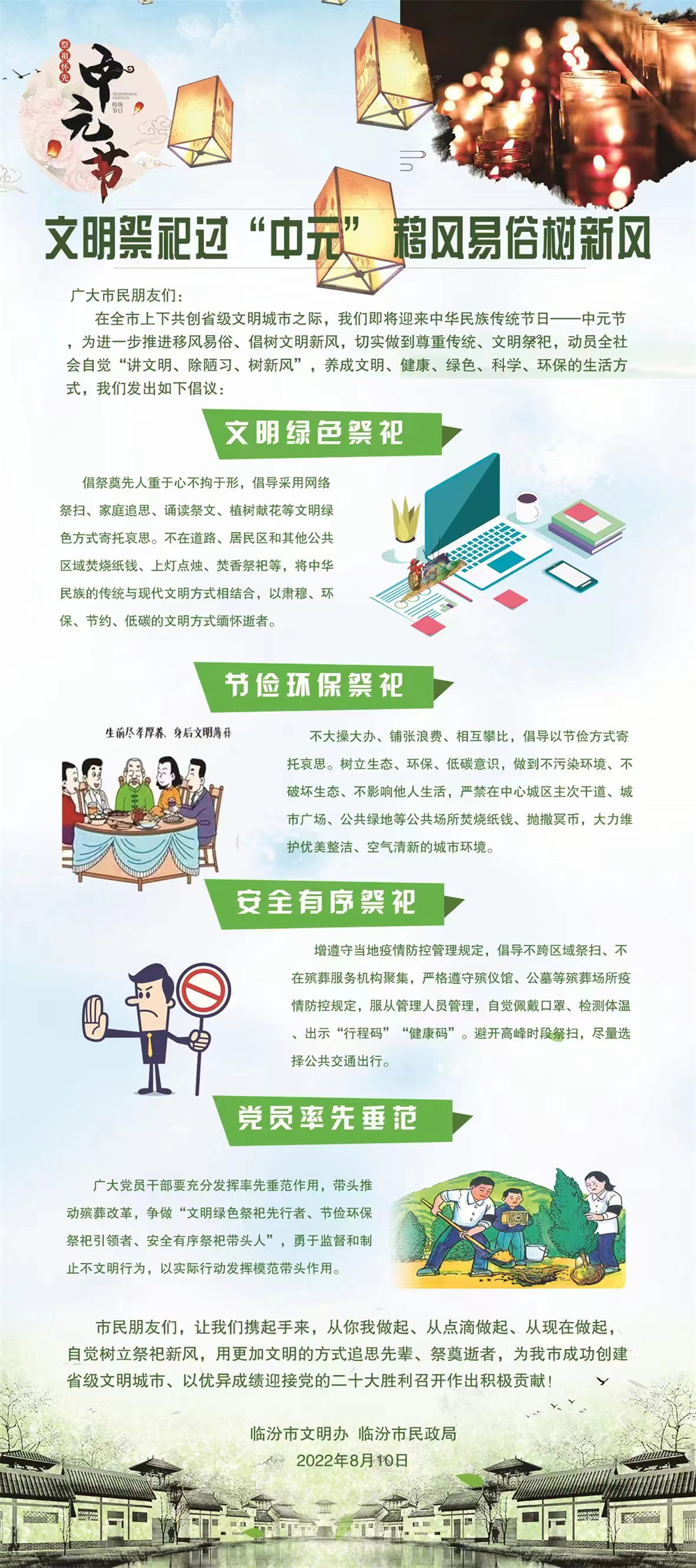 在全市上下共创省级文明城市之际,我们即将迎来中华民族传统节日——中元节,为进一步推进移风易俗、倡树文明新风,切实做到尊重传统、文明祭祀,动员全社会自觉“讲文明、除陋习、树新风”,养成文明、健康、绿色、科学、环保的生活方式,我们发出如下倡议: