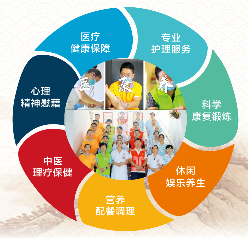 人才体系:培养有专业医生、护士、康复治疗师、医疗与养老护理员、中医理疗师、心理咨询师、社会工作者、志愿者等多工种组成的专业化复合型服务团队。将100余项标准化项目、18项中医的适宜技术,10种中医的膳食营养与养生方法,中医的情志调养方法,5种中西医联合的护理方法送进千家万户。秉承“老有所养、老有所医、老有所乐”的服务宗旨,让老年人更好保障、更有质量、更有温度的安享晚年。