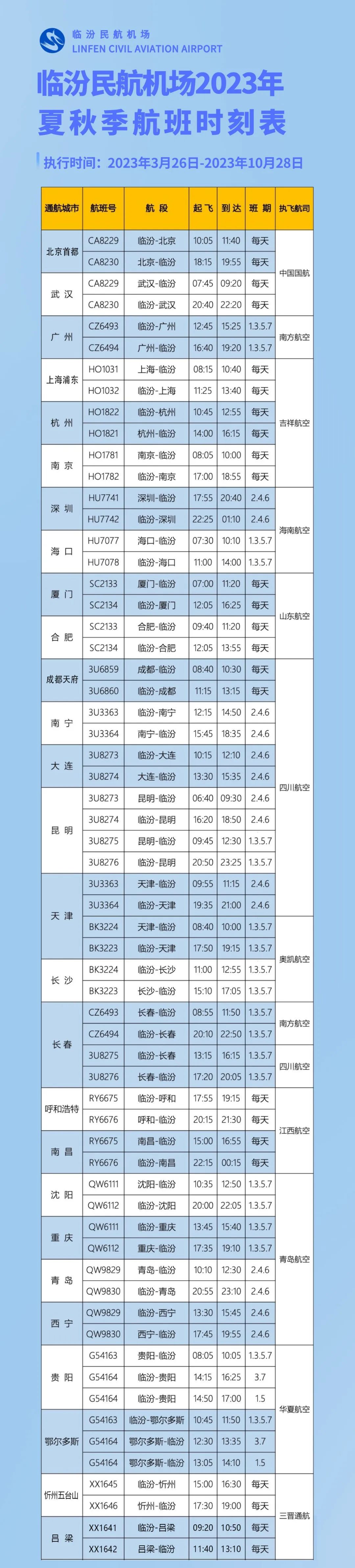 我国民航系统每年都要进行两次航班计划调整,每年3月和10月的最后一周分别开始执行夏秋航季、冬春航季航班计划。航班换季主要是考虑到旅游业淡旺季,人们出行周期性特点以及不同季节天气气压等不同,全力保障旅客出行以及航班安全。航班换季主要包括增加新航线、调整航线、调整航班时刻等工作。临汾民航机场将于3月26日至10月28日,执行民航2023年夏秋季航班时刻。此次换季,临汾民航机场全力争取民航局支持,积极协调航空公司运力时刻,在确保航线总体稳定的基础上,新增开通航线1条:“青岛=临汾=西宁”,班期每周三班(二、四、六);优化调整航线1条:“深圳=临汾”,班期每周三班(二、四、六);加密优化航线1条:“成都=临汾”,班期每天一班。