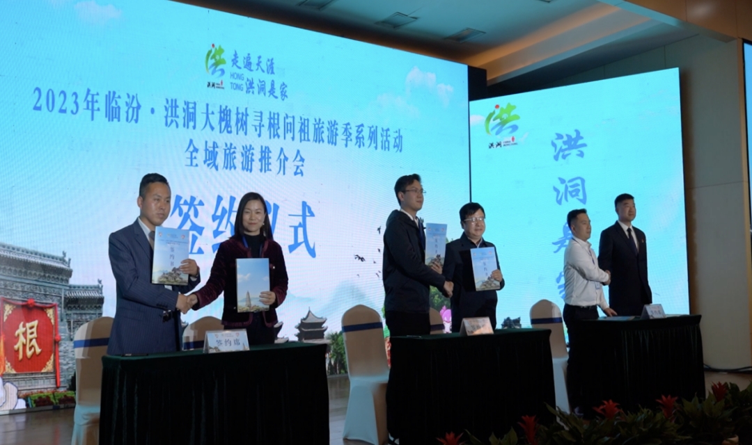 推荐会上洪洞县文物旅游服务中心主任张青龙,福州市旅游协会副会长、美亚文旅集团副总裁陈思远先生,广东研学汇国际旅行社有限公司总经理何宇鹏先生,大槐树寻根祭祖园有限公司总经理王宏建,陕西雅泰文化旅游产业发展有限公司总经理闵先,霍太山(广胜寺)旅游景区总经理梁云伟举行了签约仪式。