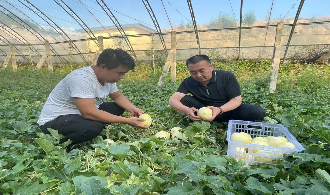三多村党支部书记薛建华(右一)和果农一起采摘甜瓜