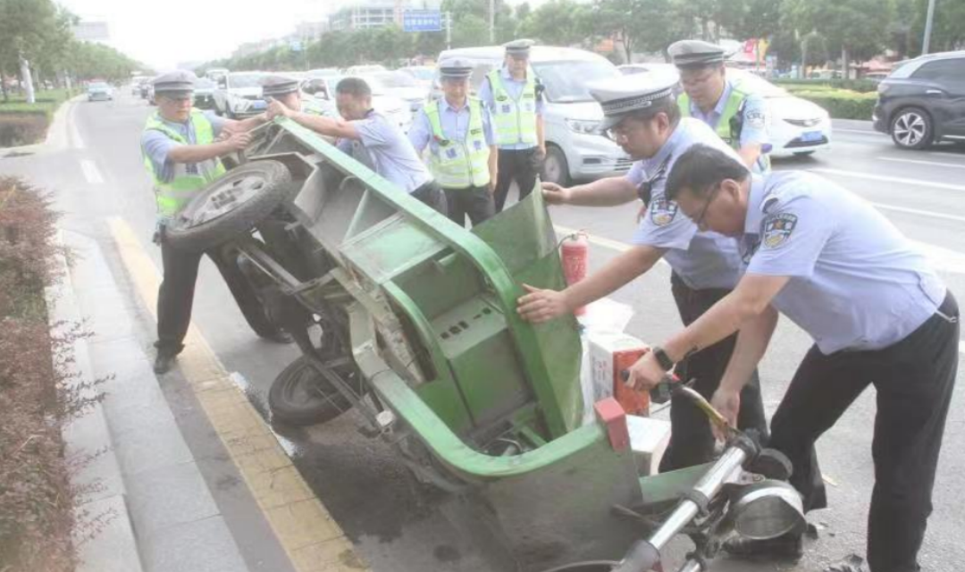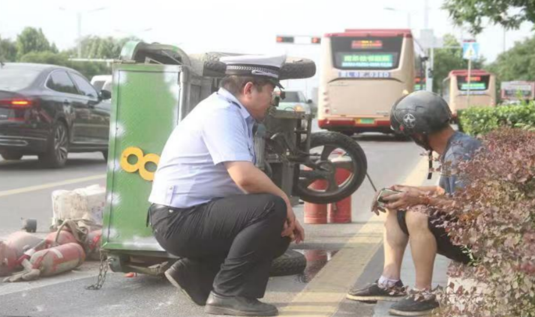 2023年6月24日下午17:50分许,江西籍务工人员顾某驾驶电动三轮车在鼓楼南大街秦蜀路由南向北行驶至尧庙十字路口(路口南约50米)时,因车辆右后轮与中心隔离花池剐蹭,导致电动三轮车侧翻,造成驾驶员头部及身体多处受伤、车辆损坏严重,所拉运的消防器材散落。该事故发生后,被临汾市公安局交警支队直属五大队民辅警及时发现,民辅警迅速开展现场紧急救助,了解到伤者情况没有大碍后,民辅警一方面现场指挥车辆有序通行,并放置反光锥筒对事故现场进行防护,防止二次事故的发生;另一方面在询问伤者情况后,通知其家属前往现场。约十分钟后,伤者家属来到了现场,将伤者运送至医院救治。