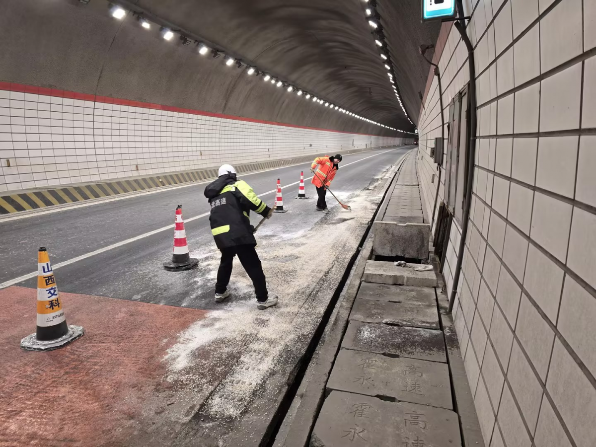 险情就是命令。隧道应急小分队迅速集结,携带阀门扳手、警示标识、排水工具等应急装备,火速奔赴现场。抵达现场后,一组规范设置警示标识,引导过往车辆减速慢行、谨慎避让;另一组迅速关闭供水阀门,精准排查漏水点,并对消防设施进行紧急修复。此时,隧道内因低温导致出现局部路面结冰。为全面消除安全隐患,汾西收费站通过沿线电子显示屏滚动发布提示,提醒过往车辆减速慢行;养护工区人员到达现场,撒布融雪剂并人工清理冰水混合物。经过二十多分钟的协同抢险,漏水消防栓修复完毕,路面冰水全部清理,隧道恢复正常通行。