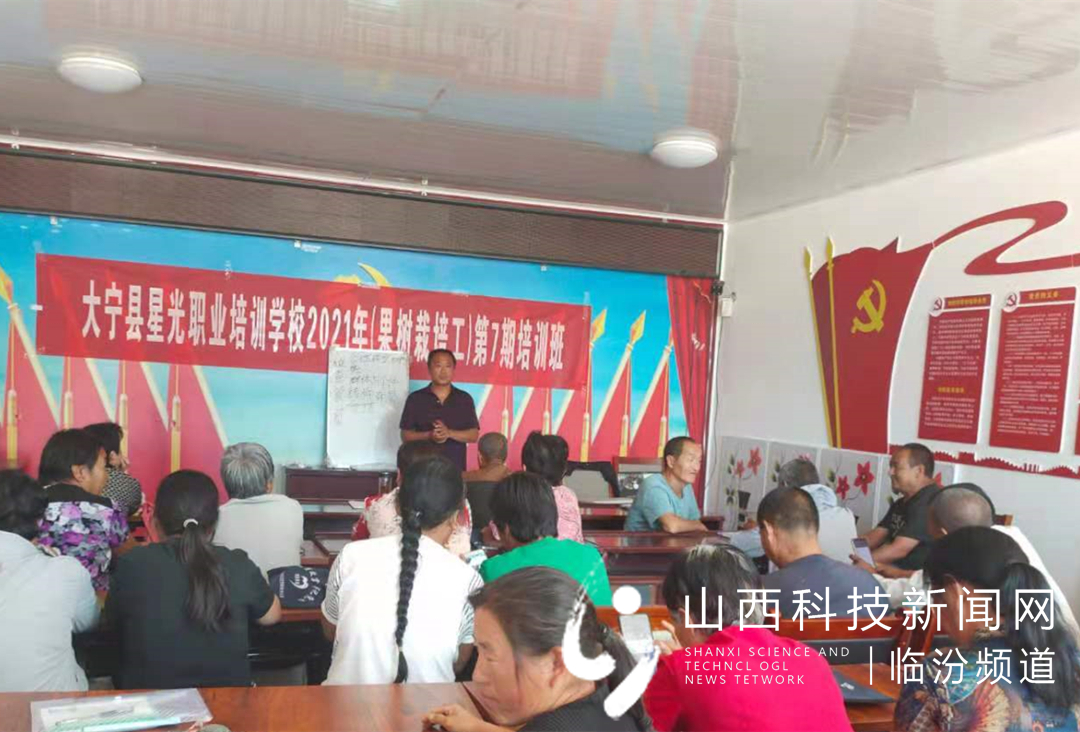 山西科技新闻网临汾讯 本着为广大农民提供就业门路,大宁县星光职业培训学校以培训新型的职业农民为己任,在大宁县人社局的大力支持下,在全县开展职能培训,开设的培训班涉及电工、电气焊、剌绣缝纫、厨师小吃、果树栽培等农村实用的技能行业。图为在太古镇坦达村的第7期果树栽培培训班。