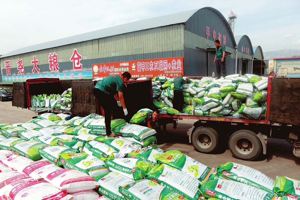 连日来,临汾市尧都区红福泰农业合作社从湖北购进650吨中化化肥、100吨种子,为今年秋粮丰收、冬小麦耕种做好充足准备。图为8月26日,合作社社员在加紧卸载到站的化肥。(王辉耀)